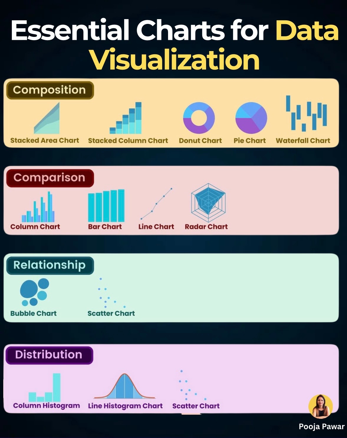 Data visualization is more than just making numbers look pretty—it’s about telling a story with data. Choosing the right chart can make the difference between confusion and clarity. Below, we’ll look at the most essential charts grouped by purpose: composition, comparison, relationship, and distribution. For each type, I’ll explain the theory, show where it shines, and share real-world examples.